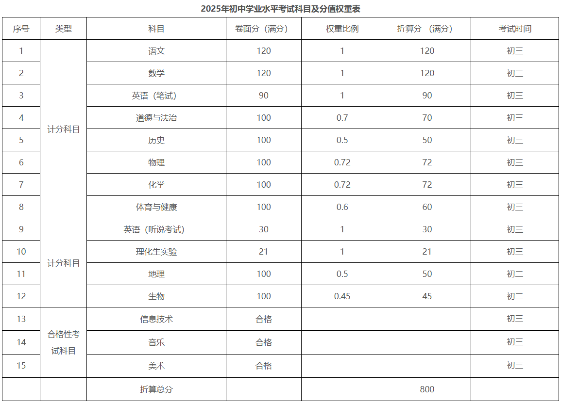 初中學(xué)業(yè)水平考試成績總分為語文、數(shù)學(xué)、英語(含聽說考試)原始分和物理、化學(xué)、歷史、道德與法治、體育與健康、生物、地理折算分之和(含理化生實驗部分),2025年初中學(xué)業(yè)水平考試成績總分為800分。