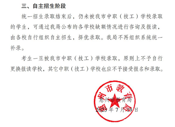 以上就是有關(guān)“惠州市 2023 年中職(技工)院校統(tǒng)一招生錄取分?jǐn)?shù)線的公告 ”的內(nèi)容,更多資訊請關(guān)注廣東中專升學(xué)網(wǎng)!